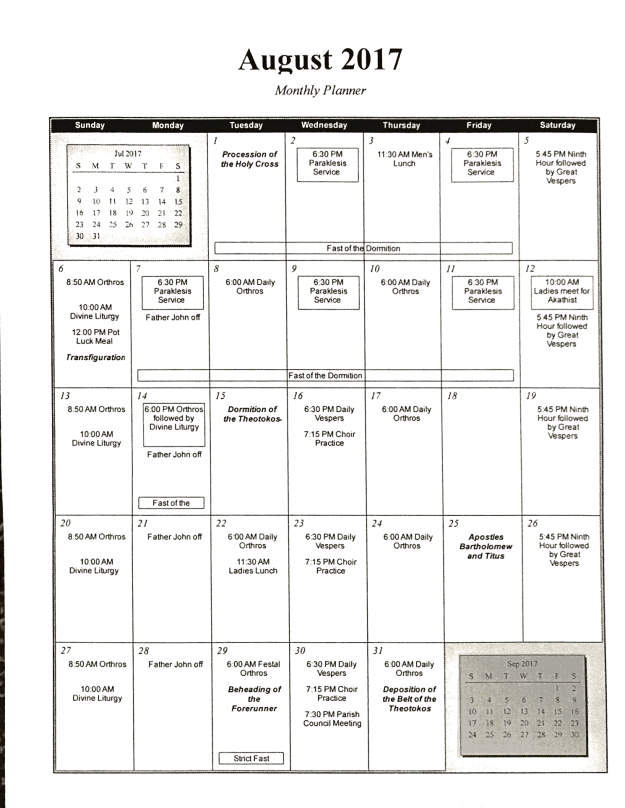 * The fast of the Dormition will begin on August 1st and run through August 14th. During this time we will pray the Paraklesis Service to the Theotokos on Mondays, Wednesdays and Fridays, as is our parish custom, beginning at 6:30 p.m.