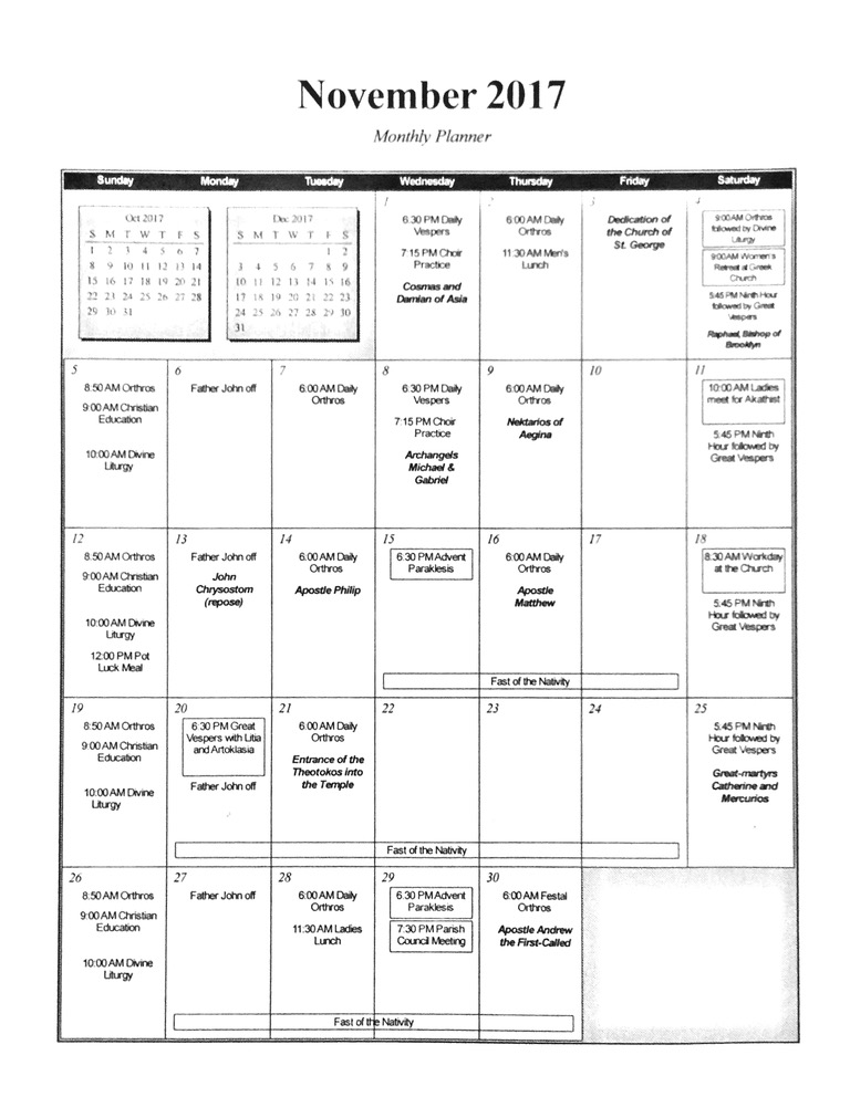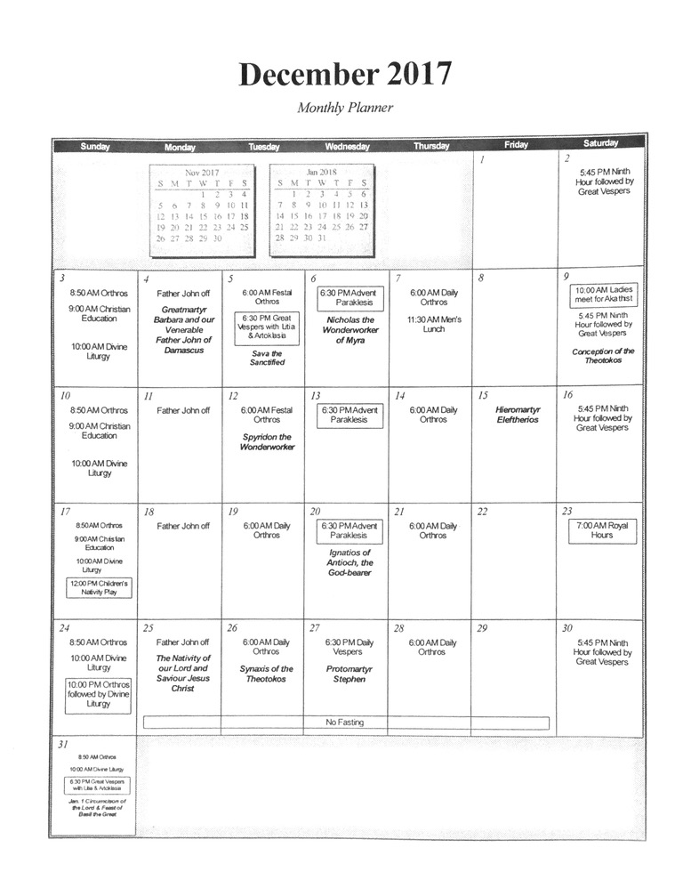 * The Nativity Fast began on Wednesday, November 15th and continues through December 24th. During this time, as is our parish custom, we will pray the Advent Paraklesis Service on Wednesday evenings in place of Daily Vespers, beginning at 6:30 p.m.