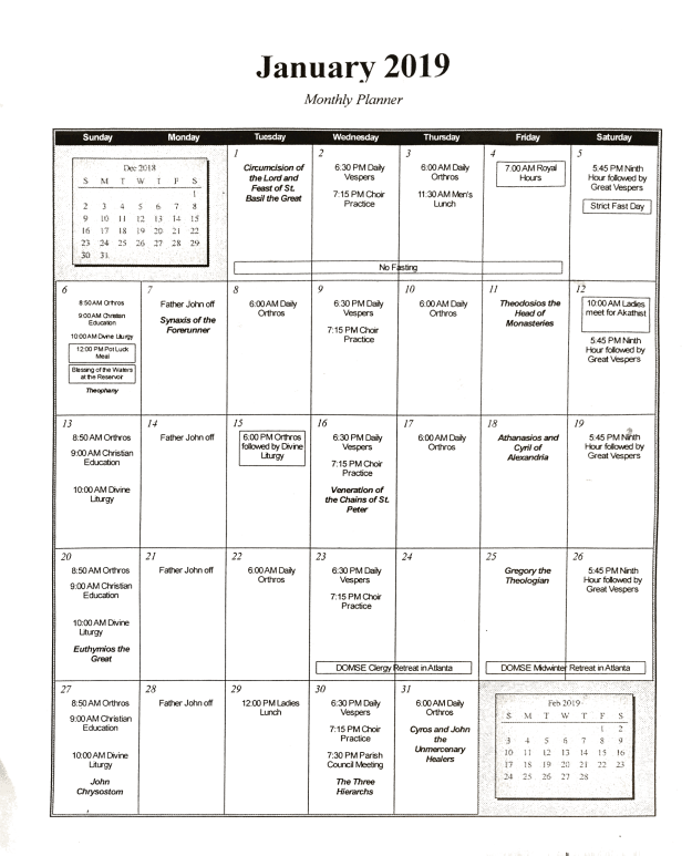 * In celebration of the Feast of Theophany next Sunday, we have moved our monthly Pot Luck Meal from the second Sunday to the first.