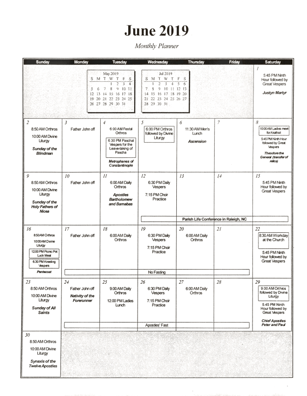 Father John will be in Raleigh/Durham NC for the Parish Life Conference June 12-15. If you need a priest during this time, please call Father James. We will have Daily Vespers and Great Vespers as usual but there will no Daily Orthros in his absence.