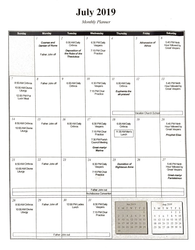 Fr. John and Kh. Janet will be out of town July 21st through August 2nd, attending the Archdiocese Convention and taking a vacation. If you need a priest during this time, please contact Fr. James.