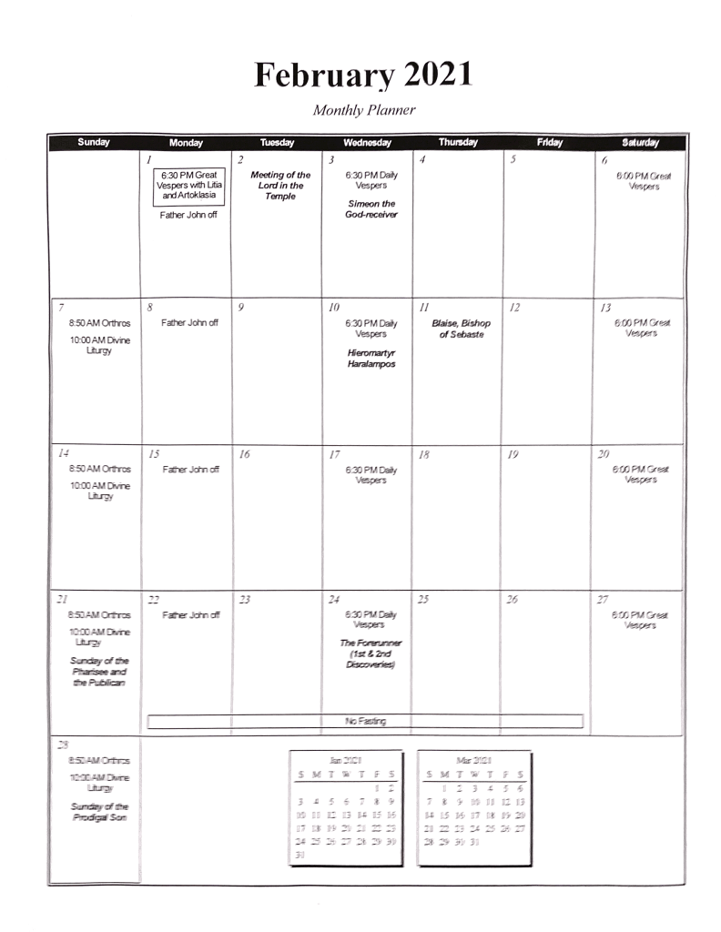 The traditional fasting discipline (no meat, dairy, eggs, fish, wine or oil) is observed on Wednesdays and Fridays of the month. However, there will be no fasting during the week following the Sunday of the Pharisee and the Publican (February 21st this year).