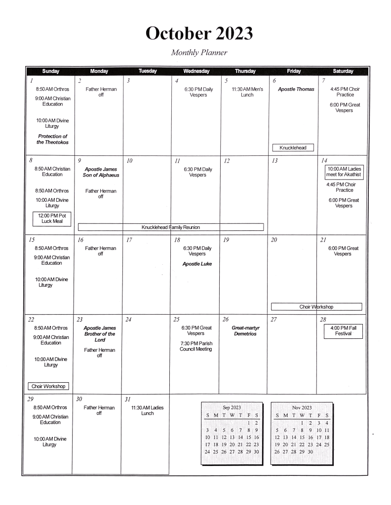 * Fall Festival – Saturday, October 28th, beginning at 4:00 p.m. (No Great Vespers that day.)