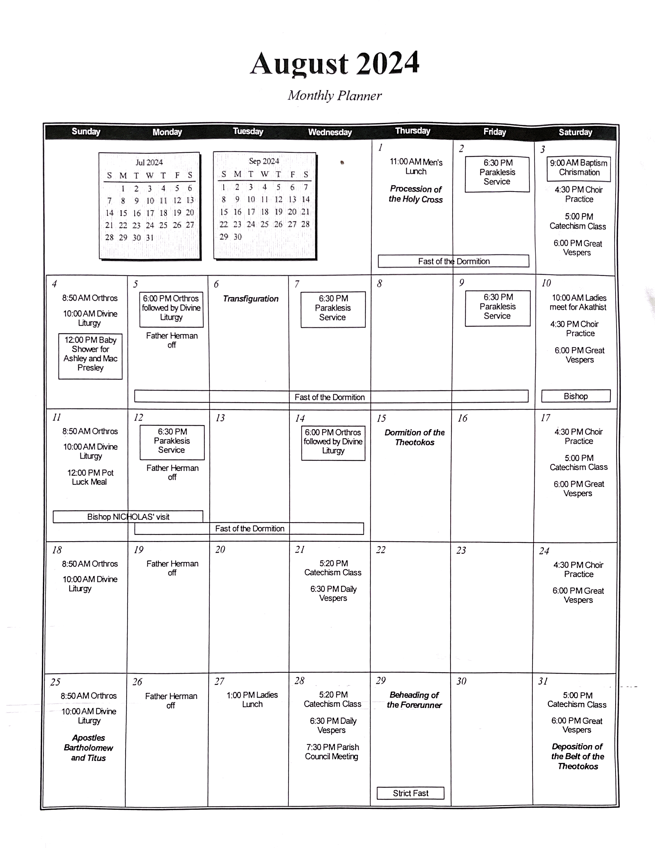 * His Grace, Bishop NICHOLAS will be with us August 10-12 (Schedule TBA).